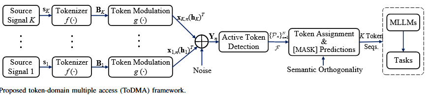 앞서 제시한 TokCom의 네 가지 시나리오 중 Multiple Access에 집중한 논문으로, 보통 주파수 영역에서의 Orthogonality를 사용하는 기존 OFDMA 등과 달리 의미적인 직교성을 활용해보자는 약간은 추상적인 아이디어인 Semantic Orthogonality를 강조했으며, 이 직교성을 MLLM이 해소할 수 있다는 아이디어에서 출발했습니다.